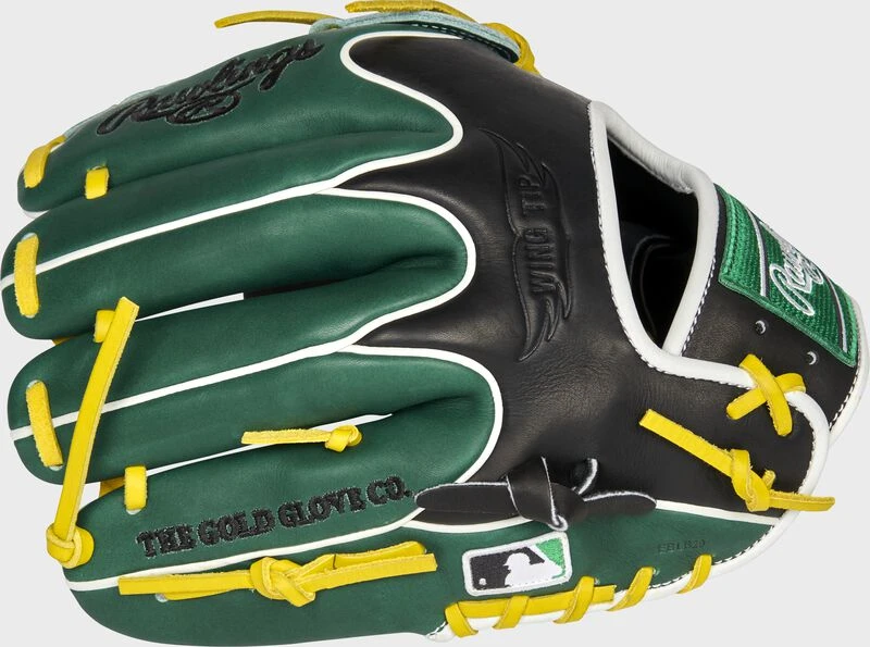 This unique HOH infield glove features a green/black/yellow team-color design and the A’s logo embroidered on the thumb. As a result, this glove makes the perfect gamer, or a great collector’s item for any Athletics fan too! The 11.5-inch glove was constructed in our 200 pattern, popular for it’s deep, round pocket promoting lightning fast ball transfers and great versatility across the infield. It also has our popular Wing Tip back and laced 2-piece solid web that perfectly accents the A’s logo.