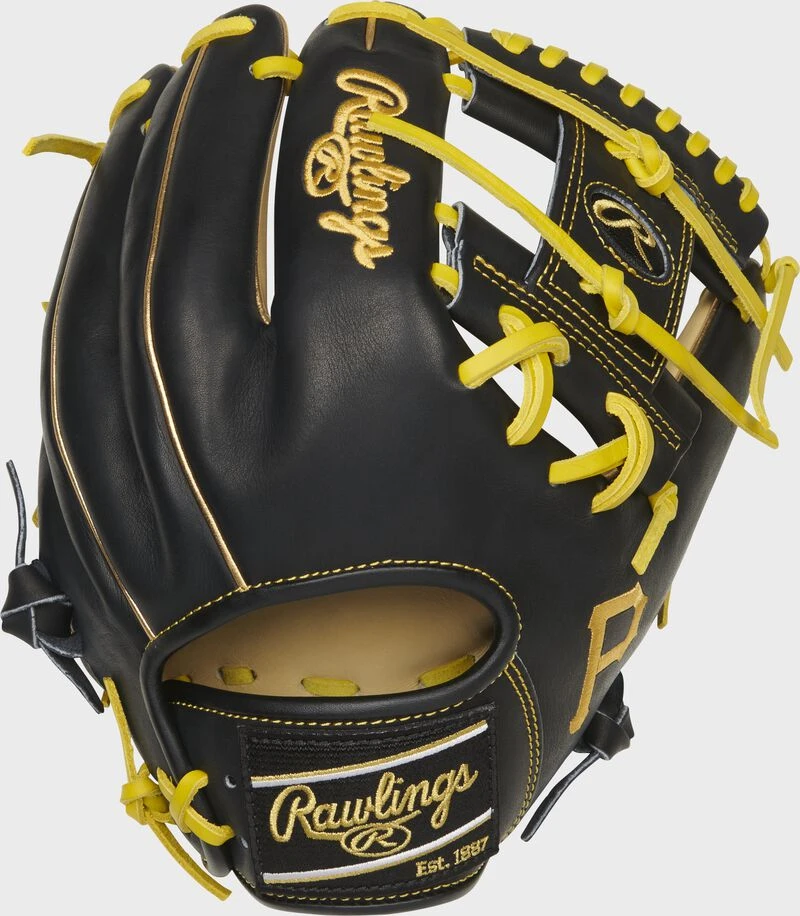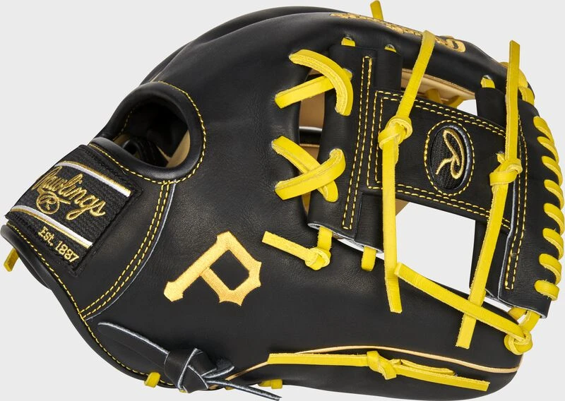 This unique HOH infield glove features a black/yellow team-color design and the Pirates logo embroidered on the thumb. As a result, this glove makes the perfect gamer, or a great collector’s item for any Pirates fan too! The 11.5-inch glove was constructed in our 200 pattern, popular for it’s deep, round pocket promoting lightning fast ball transfers and great versatility across the infield. It also has our popular Pro I-web that perfectly accents the Pirates logo.