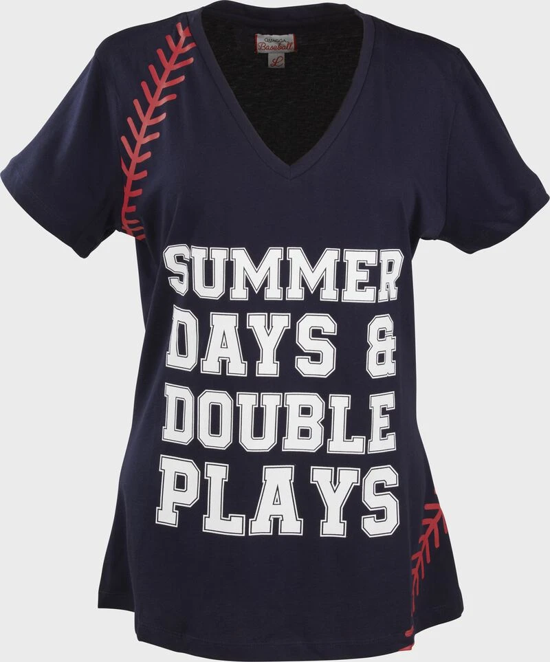 This women’s summer days V-neck t-shirt is the perfect shirt to wear out to the ballpark on the hot summer days. This navy short sleeve shirt features a stylish baseball stitch design, and “Summer Days & Double Plays” graphic to show you’re a fan of the game. This shirt is perfect for baseball mom’s who love spending summer days at the ball park. Order yours today!